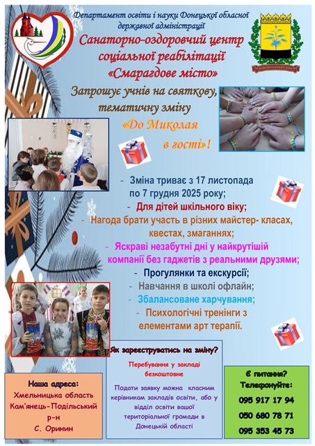 Департамент освіти і науки облдержадміністрації проводить інформаційну кампанію для батьків (законних представників), діти яких наразі перебувають на території Донецької області та наражаються на небезпеку під час бойових дій та дітей, які потребують соціальної уваги та підтримки. Запрошуємо на безпечне офлайн навчання, відпочинок та соціальну реабілітацію дітей віком від 6 до 17 років до санаторно-оздоровчого центру соціальної реабілітації «Смарагдове місто», релокованого до с. Оринин Кам’янець-Подільського району Хмельницької області.